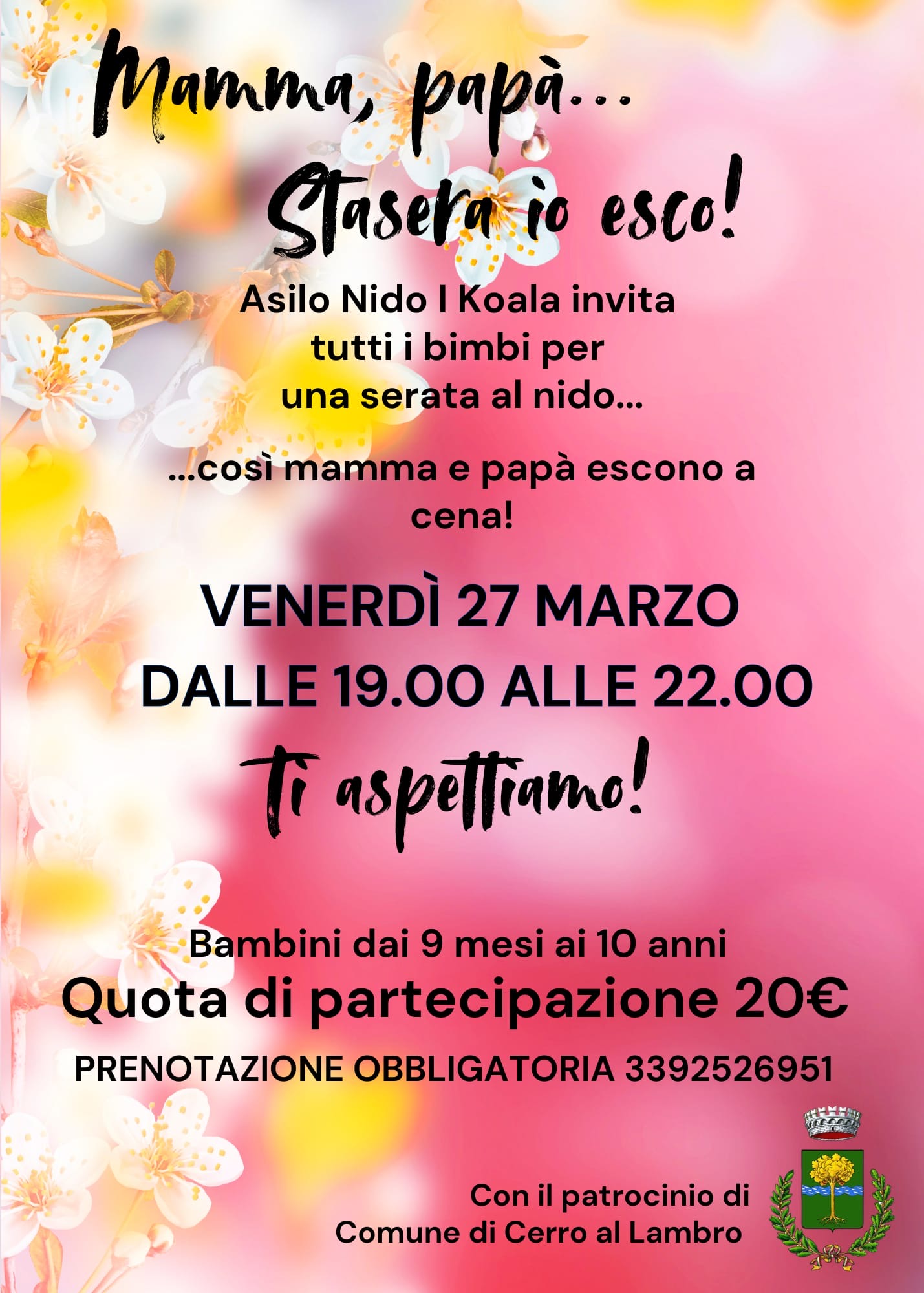 L'Asilo Nido I Koala, in via Giovanni Falcone 4 a Cerro al Lambro, organizza, con il patrocinio del Comune di Cerro al Lambro, la seconda serata al nido per tutti i bambini dai 9 mesi ai 10 anni.