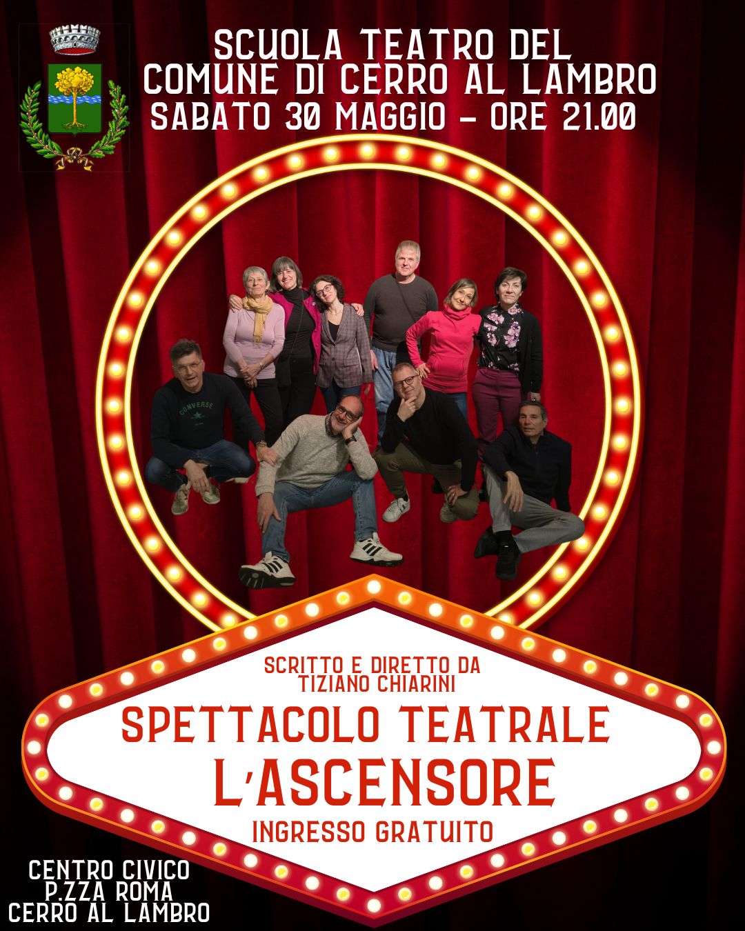 Il Comune di Cerro al Lambro è lieto di invitarvi allo spettacolo organizzato dal Laboratorio teatrale del Comune di Cerro al Labro che si terrà presso il CENTRO CIVICO in Piazza Roma SABATO 30 MAGGIO alle ore 21.00.