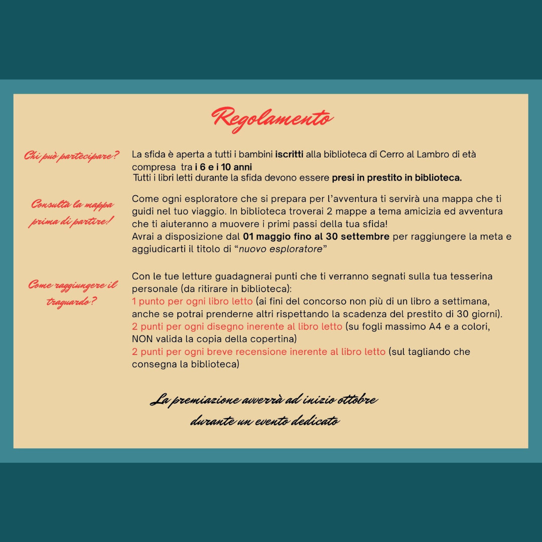 La sfida è aperta a tutti i bambini iscritti alla biblioteca di Cerro al Lambro di età compresa tra i 6 e i 10 anni. Tutti i libri letti durante la sfida devono essre presi in prestito in biblioteca.