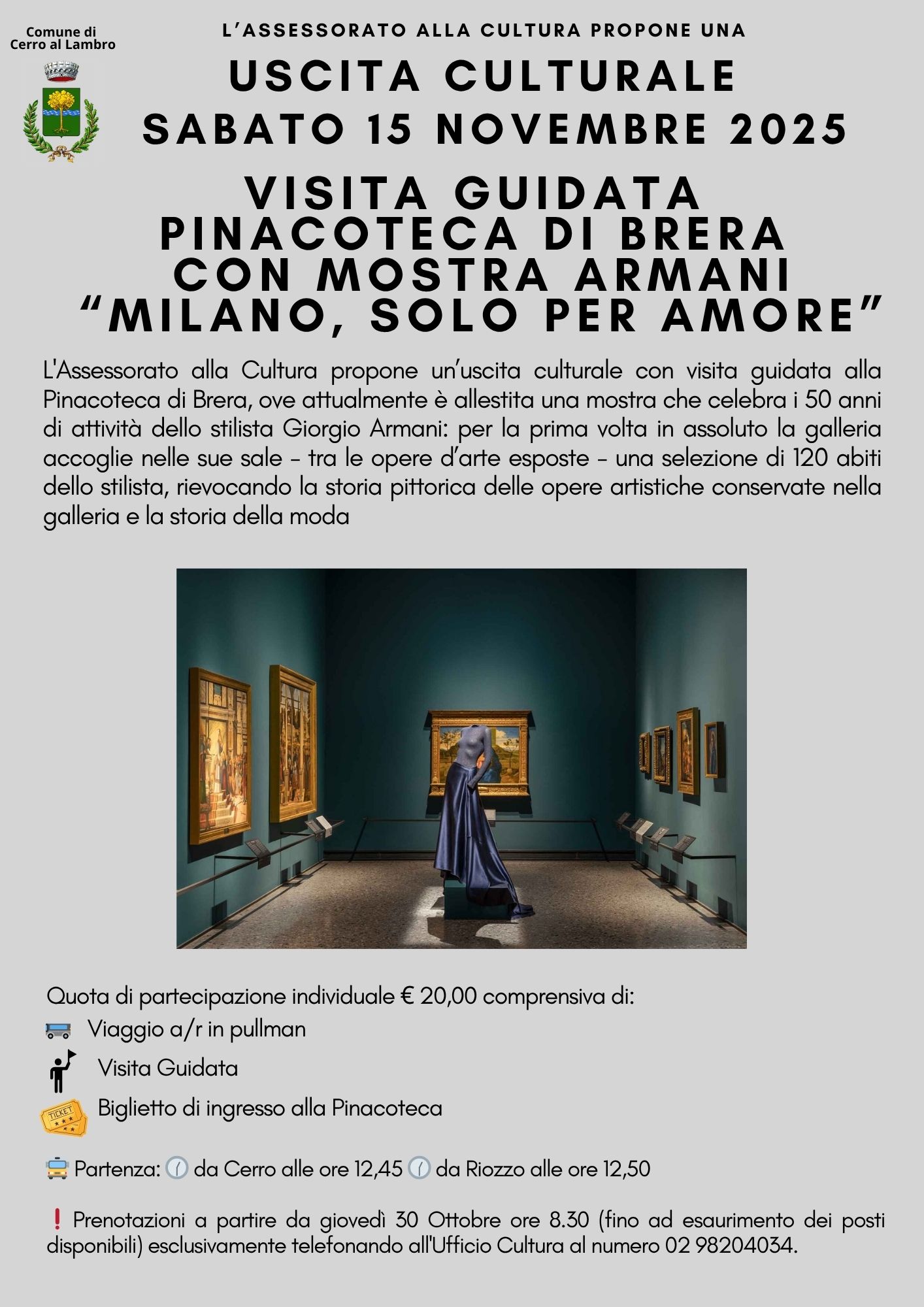 L'assessorato alla cultura propone un'uscita culturale con visita guidata alla Pinacoteca di Brera, ove attualmente è allestita una mostra che celebra i 50 anni di attività dello stilista Giorgio Armani: per la prima volta in assoluto la galleria accoglie nelle sue sale - tra le opere d’arte esposte - una selezione di 120 abiti dello stilista, rievocando la storia pittorica delle opere artistiche conservate nella galleria e la storia della moda.