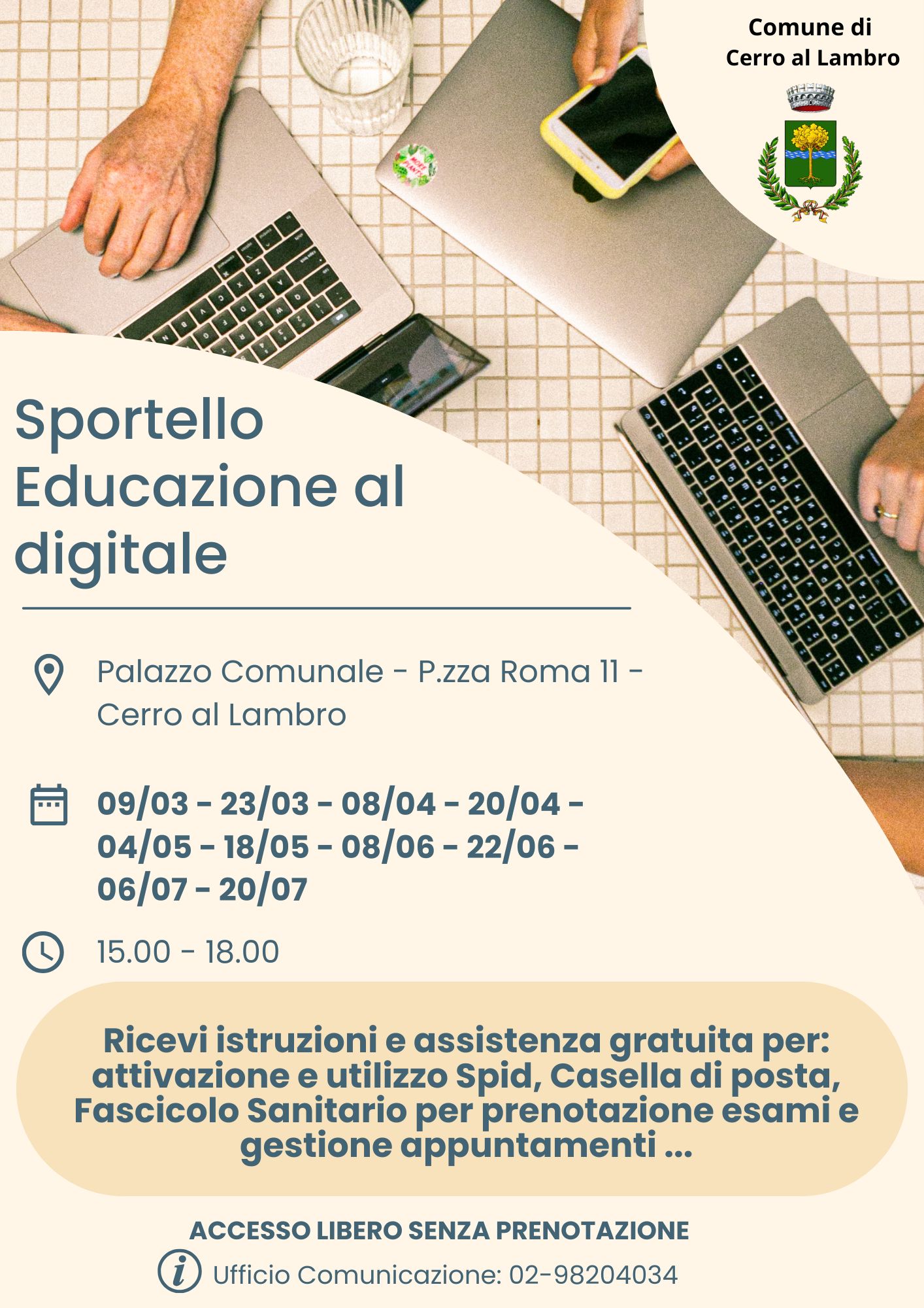 Nuove date 2026 per lo Sportello Educazione al digitale di Cerro al Lambro situato all'interno del Palazzo Comunale in Piazza Roma: 8 aprile, 20 aprile, 4 maggio, 18 maggio, 8 giugno, 22 giugno, 6 luglio, 20 luglio. L'orario di ricevimento è il seguente: dalle 15.00 alle 18.00.