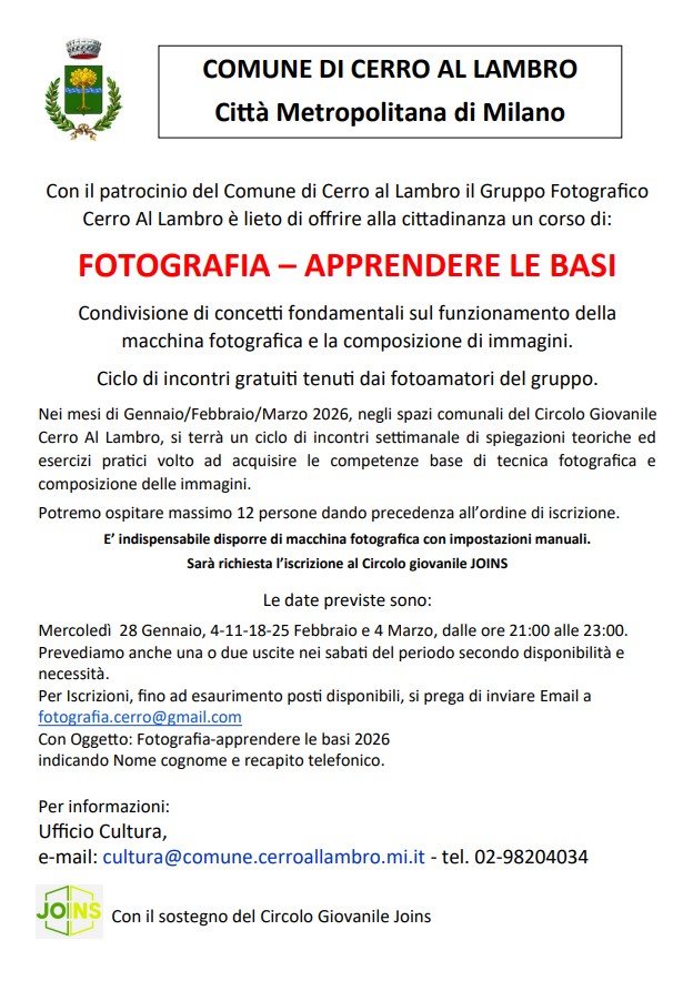 Con il patrocinio del Comune di Cerro al Lambro il Gruppo Fotografico Cerro al Lambro è lieto di offrire alla cittadinanza, a partire dal mese di gennaio 2026, un corso di FOTOGRAFIA - APPRENDERE LE BASI.