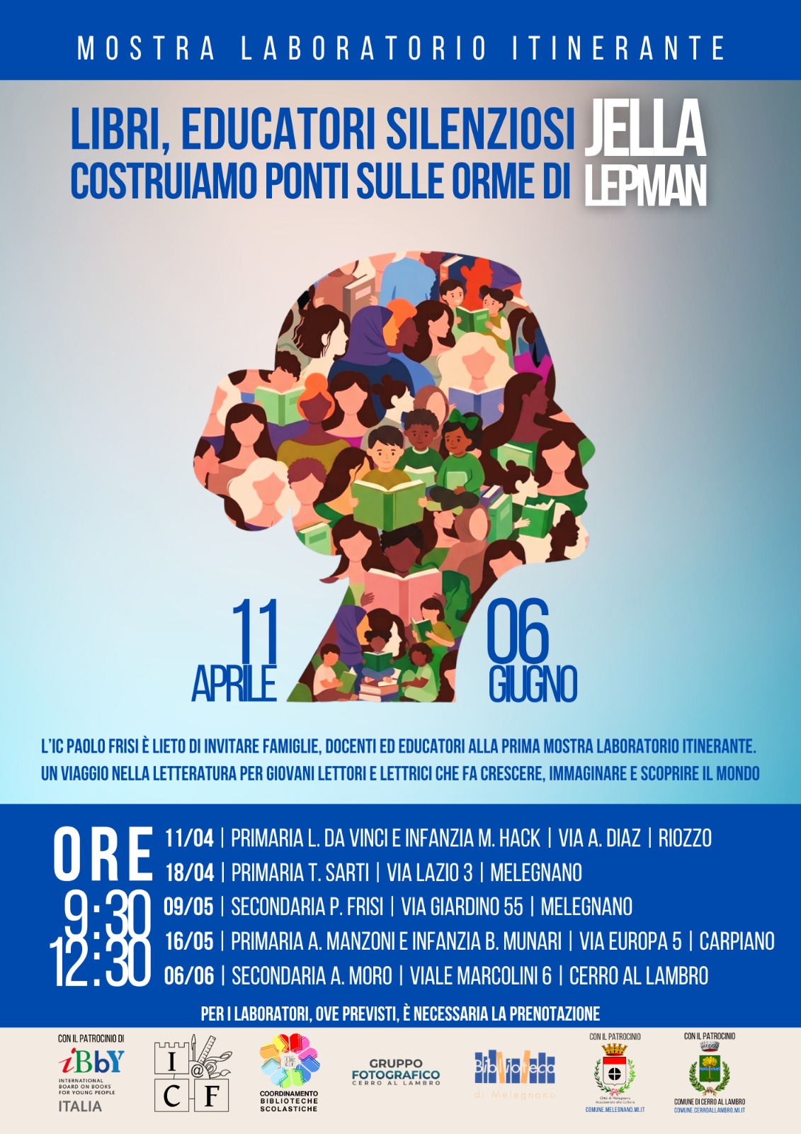 Con il patrocinio del Comune di Cerro al Lambro, l'Istituto I.C. Frisi, è lieto di invitare famiglie, docenti ed educatori alla prima mostra laboratorio itinerante dal titolo: "Libri, educatori silenziosi. Costruiamo ponti sulle orme di Jella Lepman". Un viaggio nella letteratura per giovani lettori e lettrici che fa crescere, immaginare e scoprire il mondo.